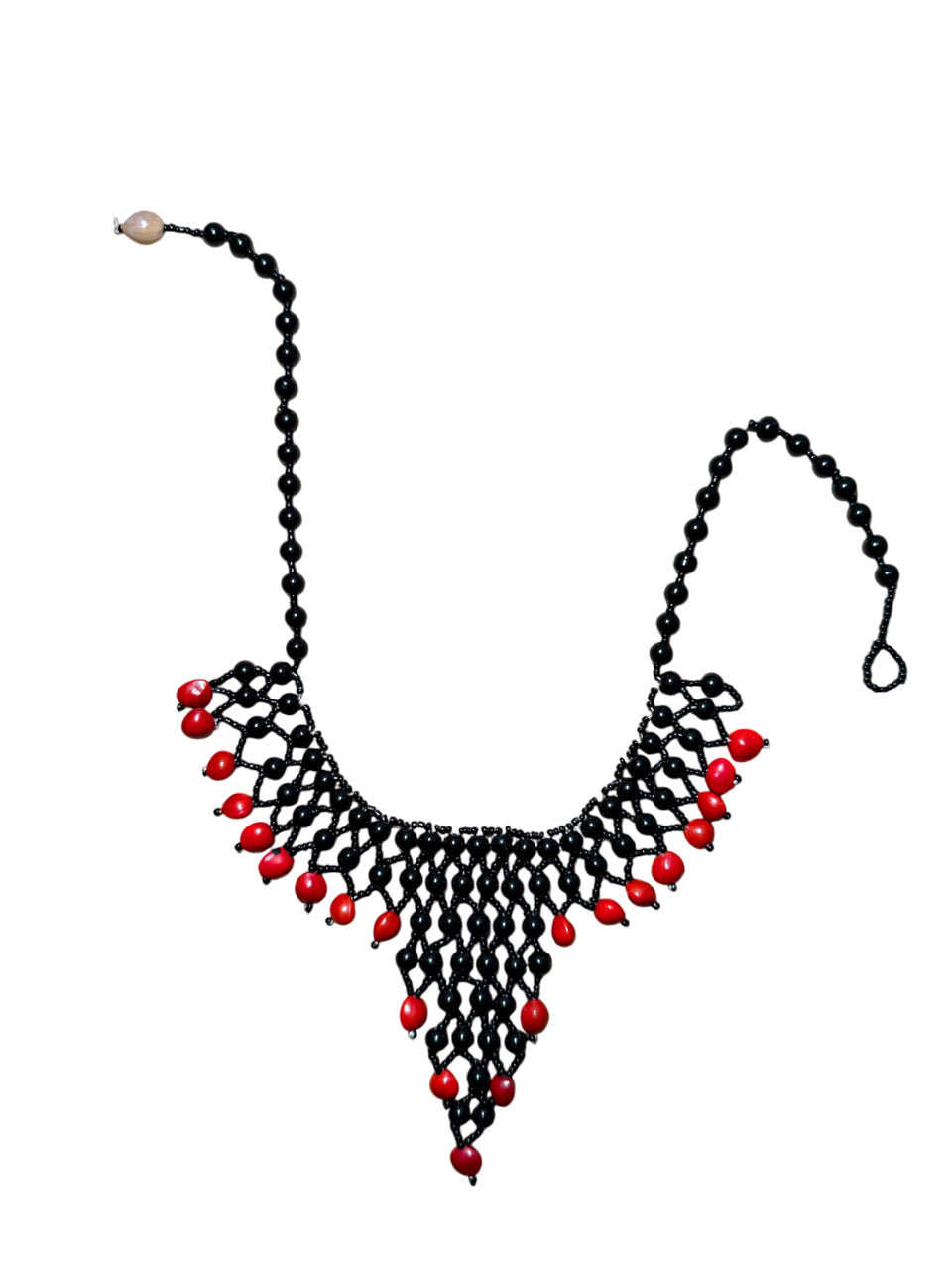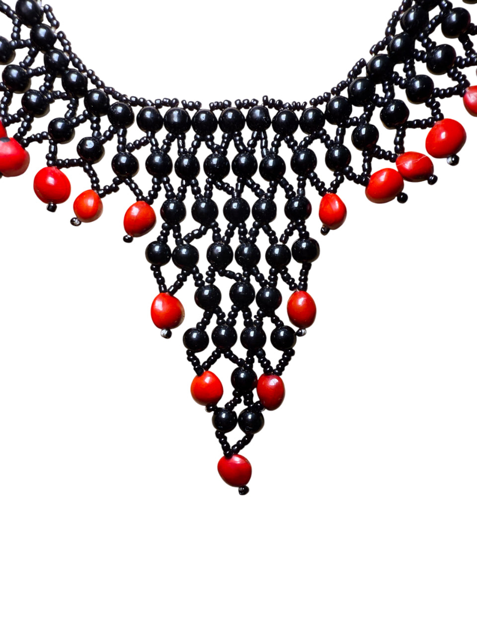 Hecho a mano por artesanas amazónicas con semillas naturales de huayruro y cuentas negras, es un amuleto de protección y poder personal.
