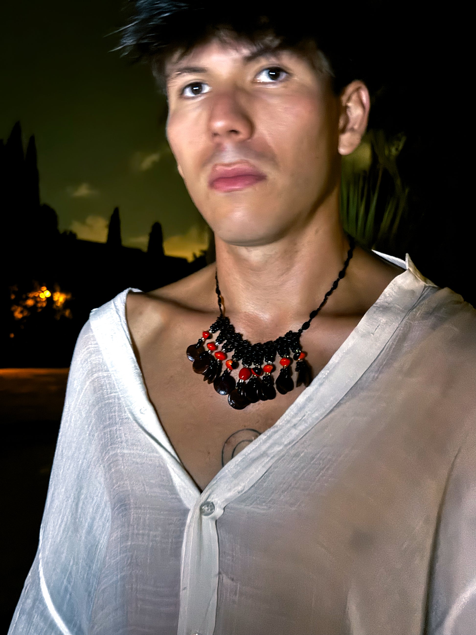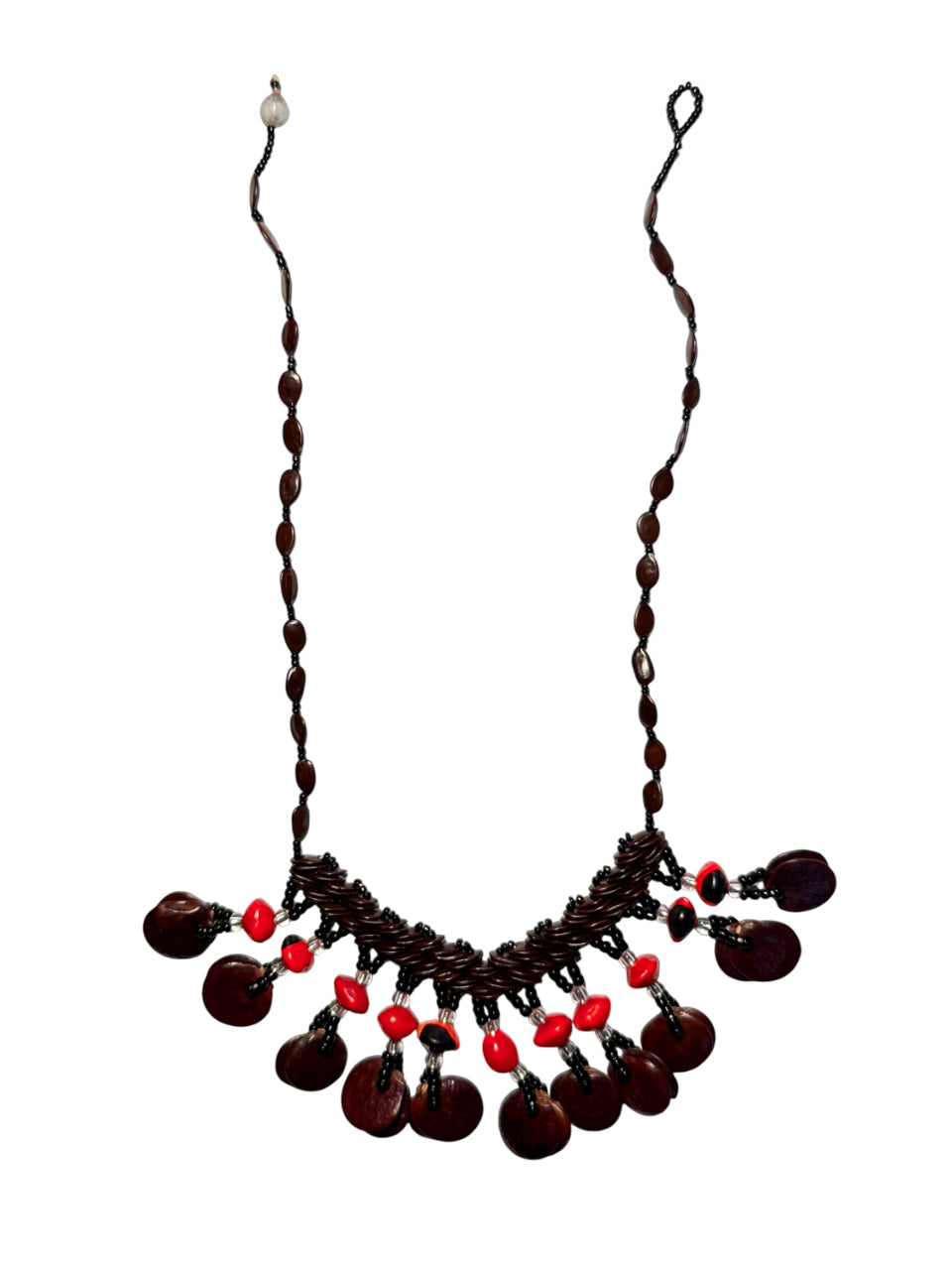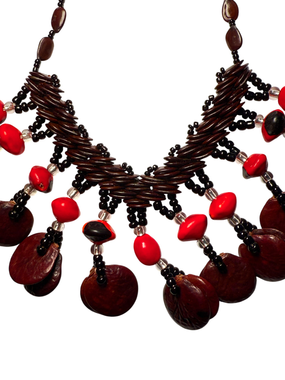 Hecho a mano con semillas naturales amazónicas ( llamaplata, pashaca y huayruro ) su diseño recuerda los collares ceremoniales de las tribus ancestrales.