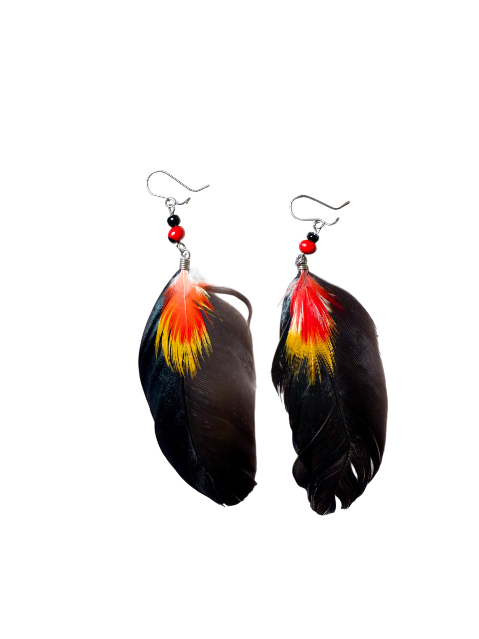 Pendientes hechos a mano con auténticas plumas de guacamayo que combinan la fuerza del negro con destellos ardientes de rojo y amarillo, evocando la energía y vitalidad del fuego.