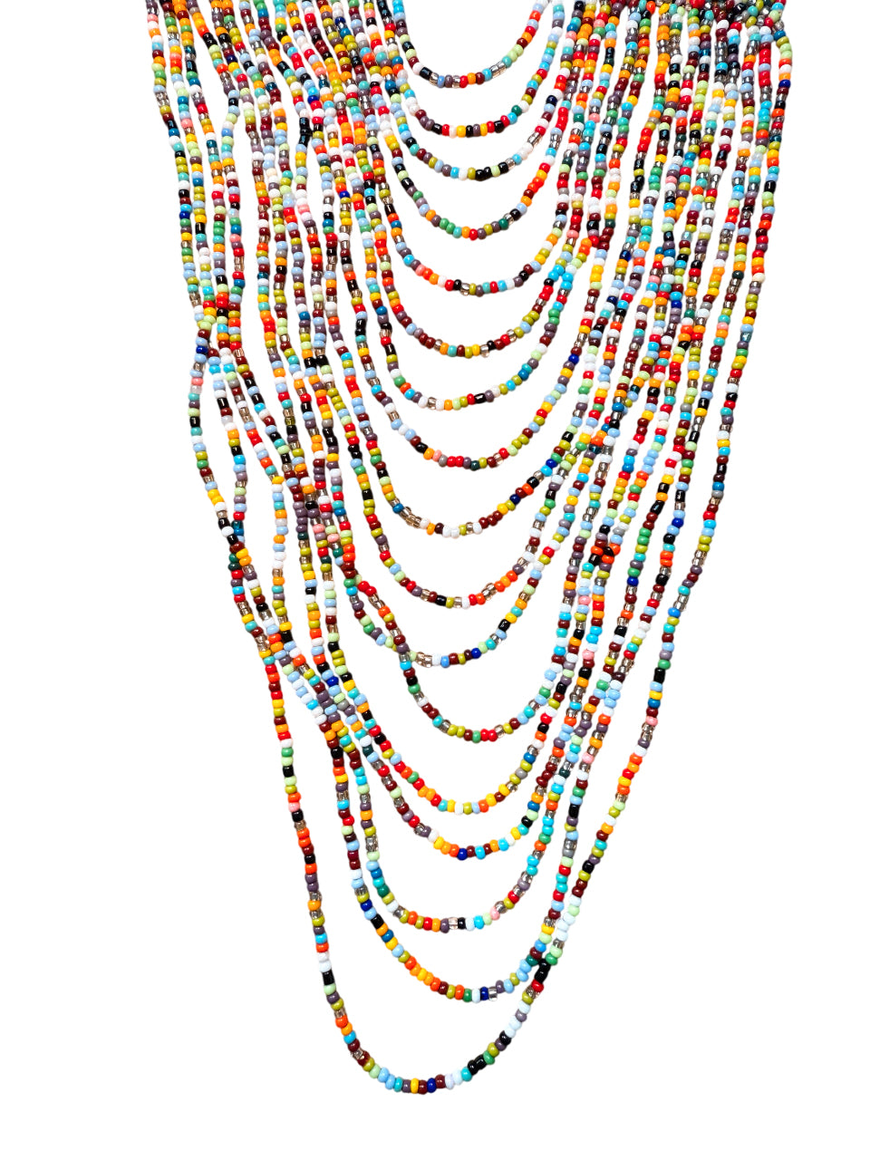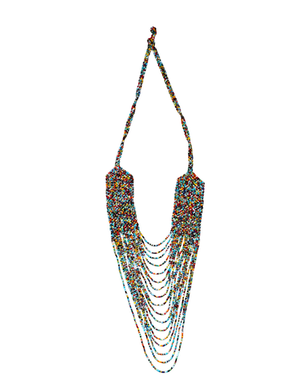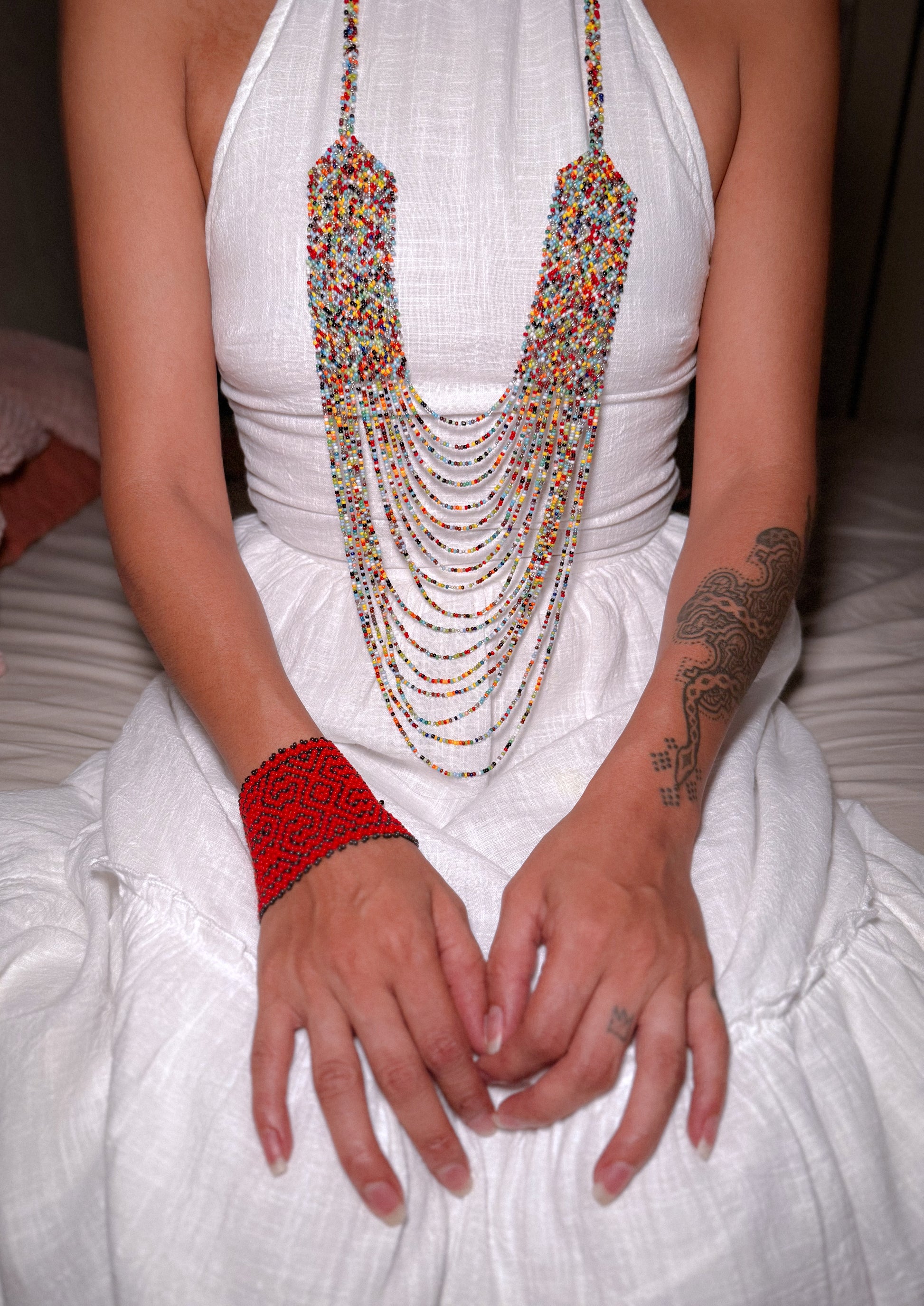 Hecho a mano con diminutas cuentas multicolores de alta resistencia, despliega una cascada de más de diez tonos vibrantes que danzan con la luz creando un mosaico único y llamativo.