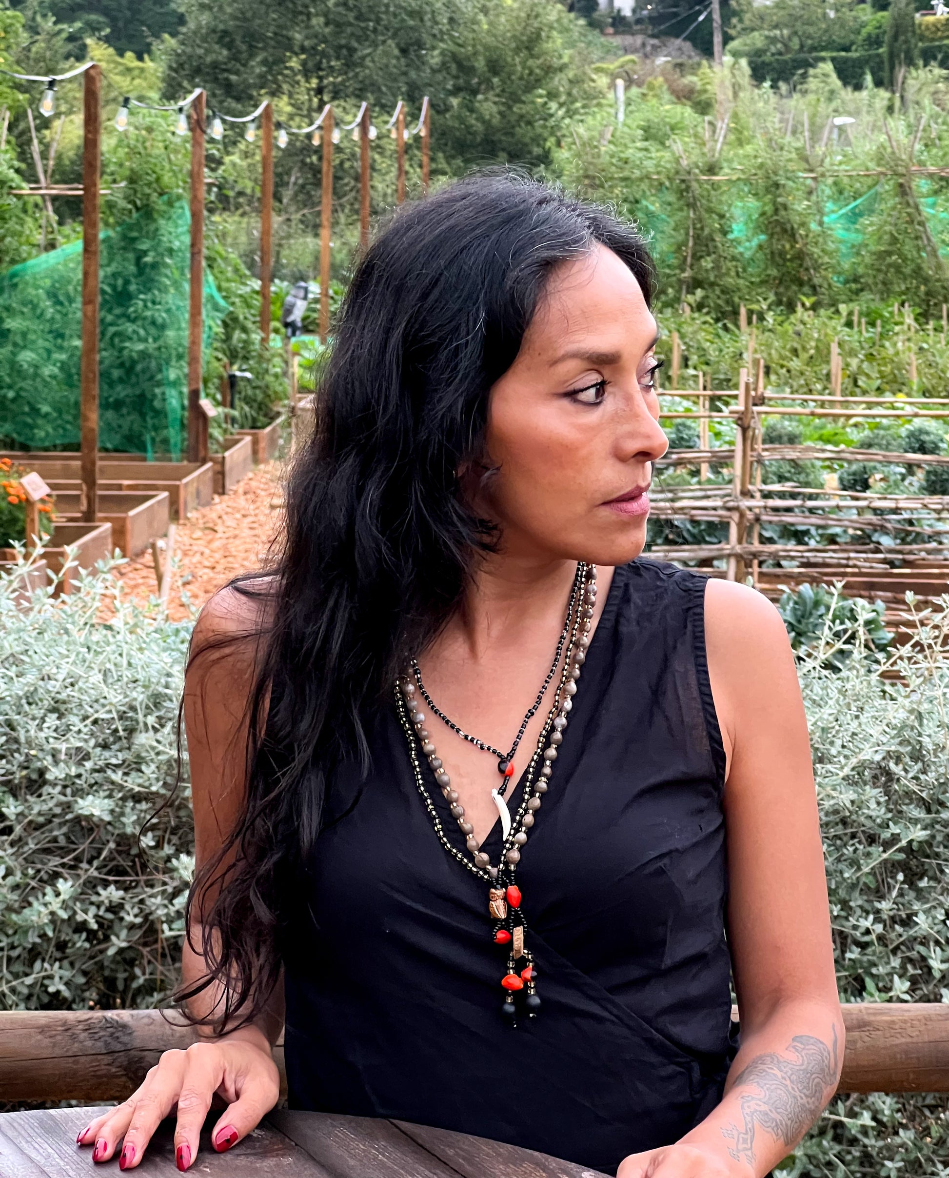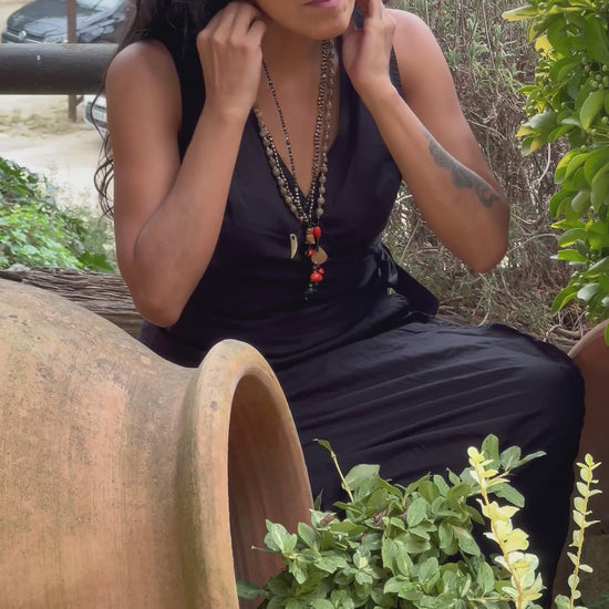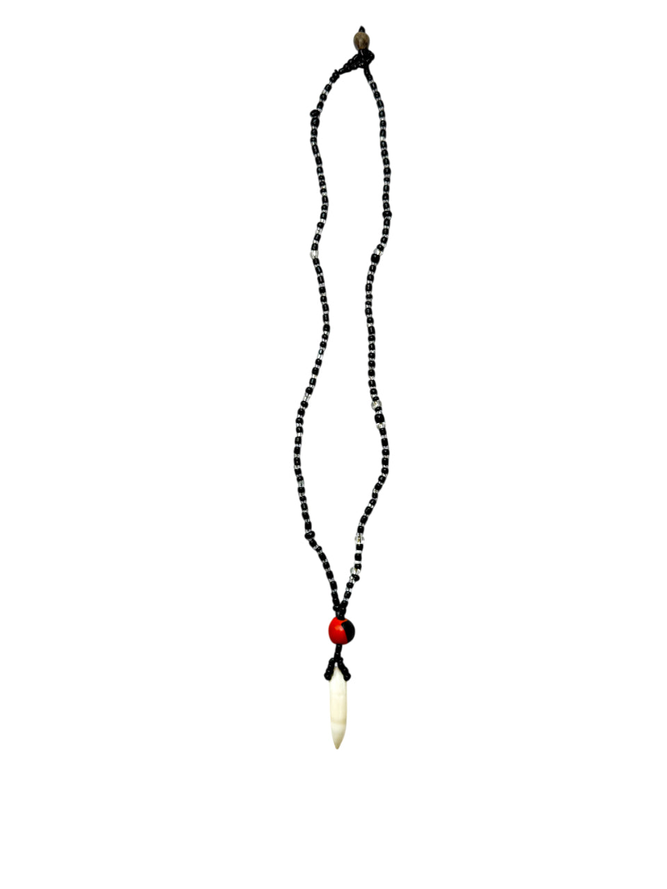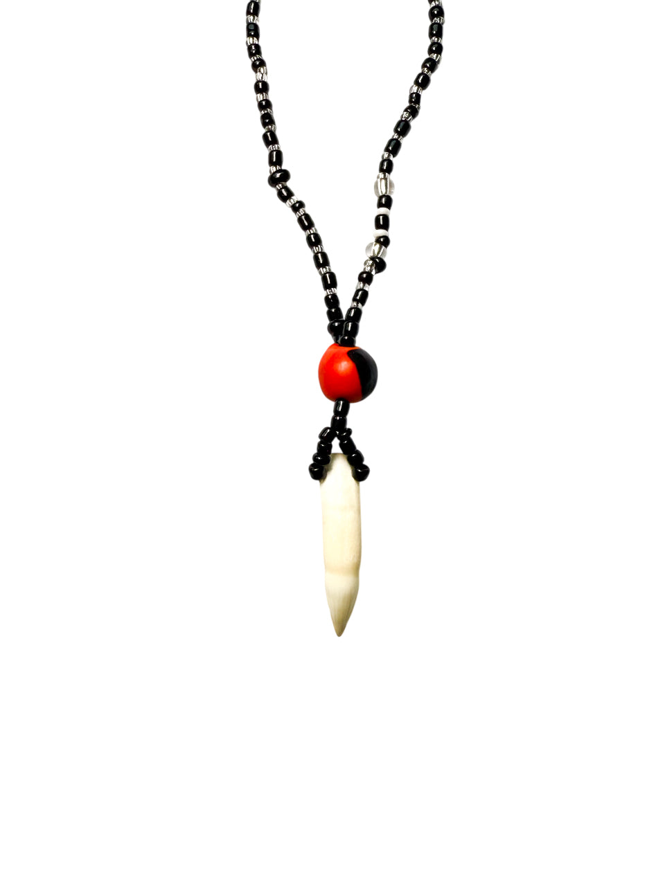 Este colgante elaborado artesanalmente con cuentas, une la energía ancestral del huayruro (rojo y negro, símbolo de fortuna y resguardo) con la fuerza instintiva de un colmillo auténtico, emblema de poder, valentía y conexión con la naturaleza.