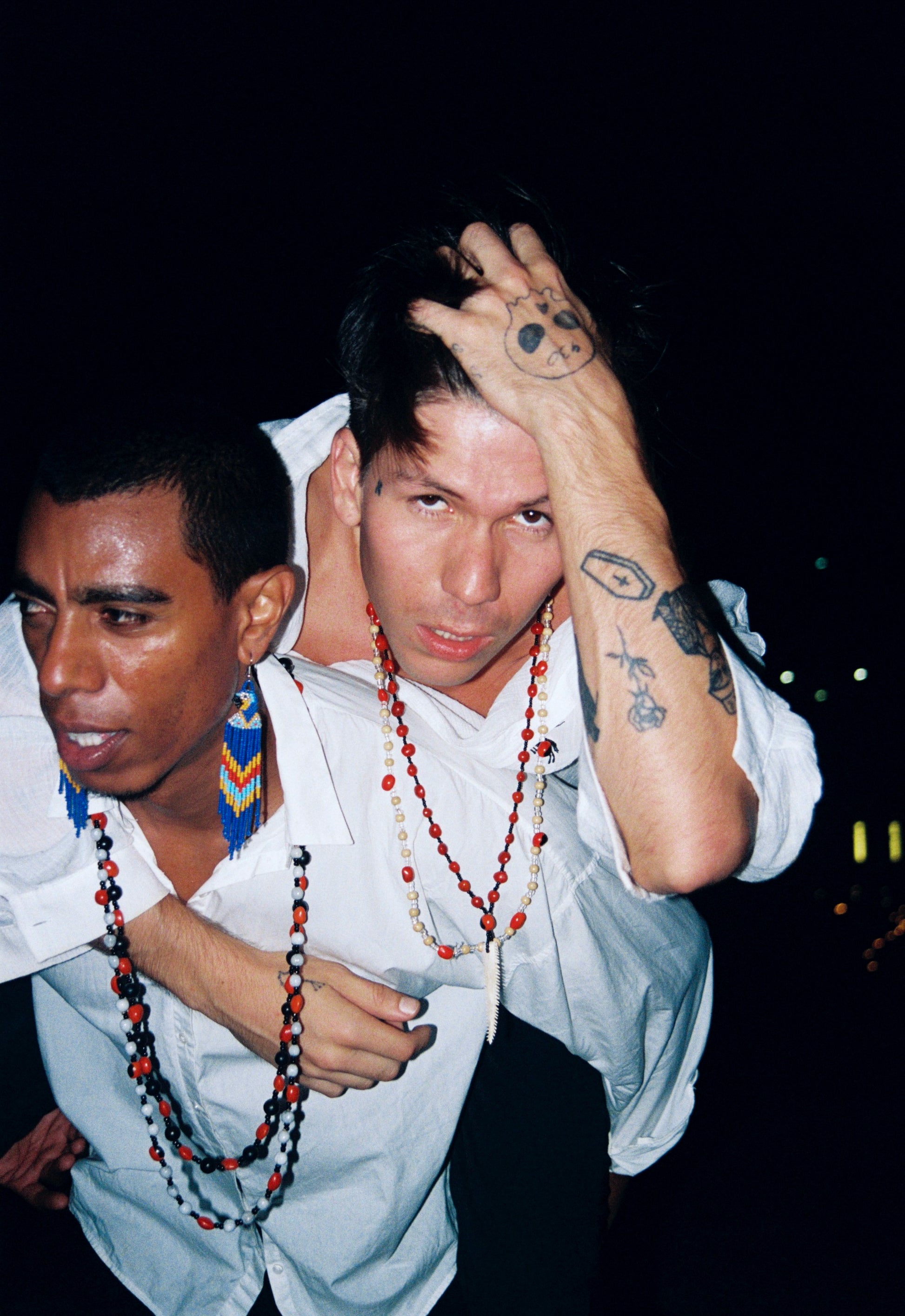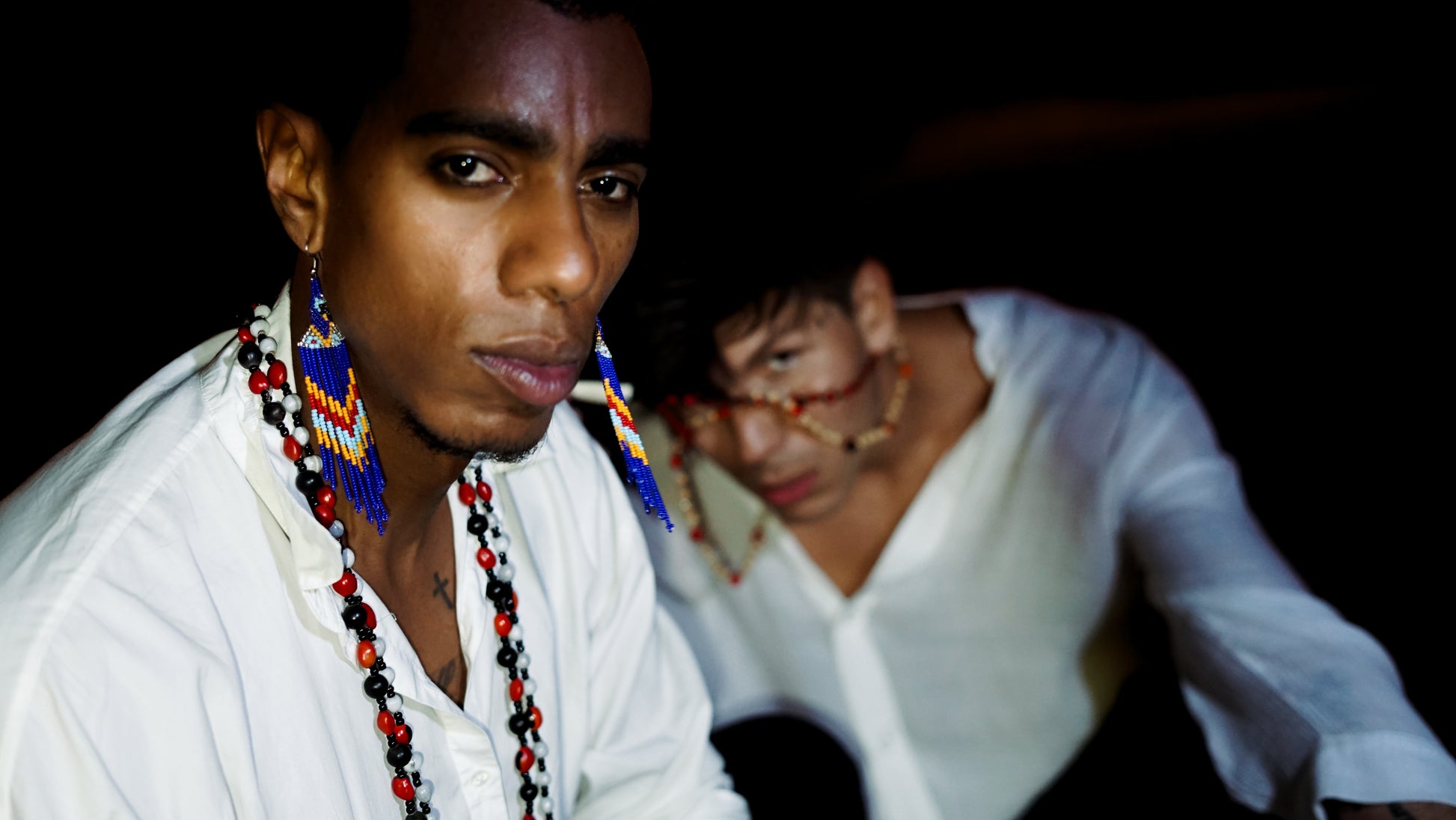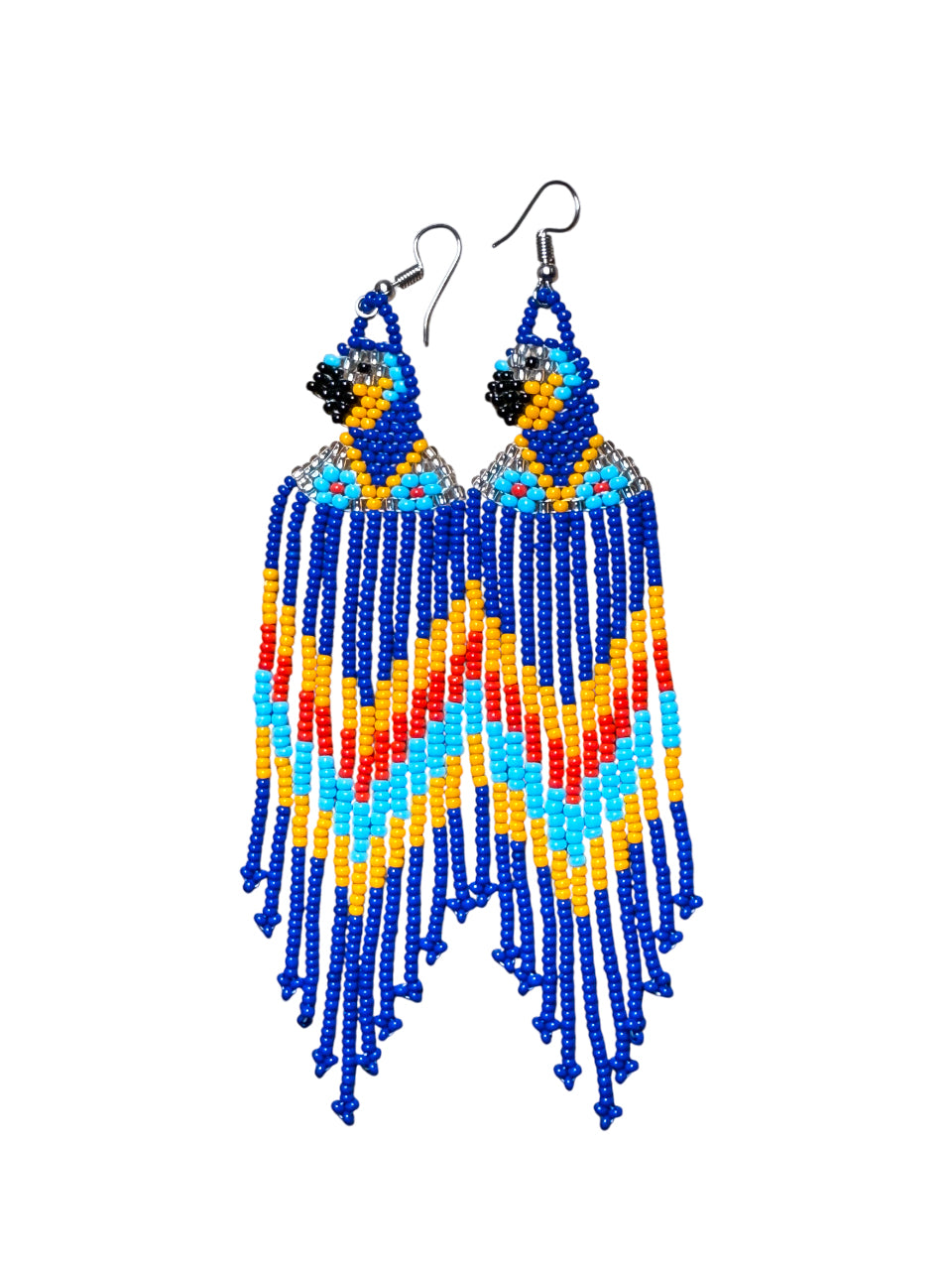 Hechos a mano con cuentas en tonos azul, naranja, turquesa y rojo, inspirados en el plumaje tropical de la selva amazónica.