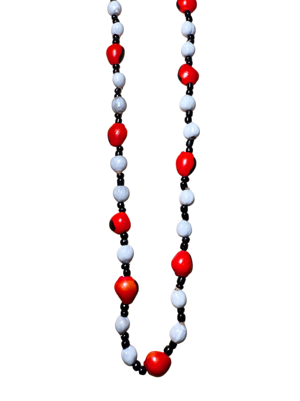 Hecho a mano con semillas naturales, honrando la tradición ancestral y la energía felina. Combina semillas de huayruro y senecio en tonos rojos y grises que representan la dualidad entre fuego y piedra, instinto y sabiduría.