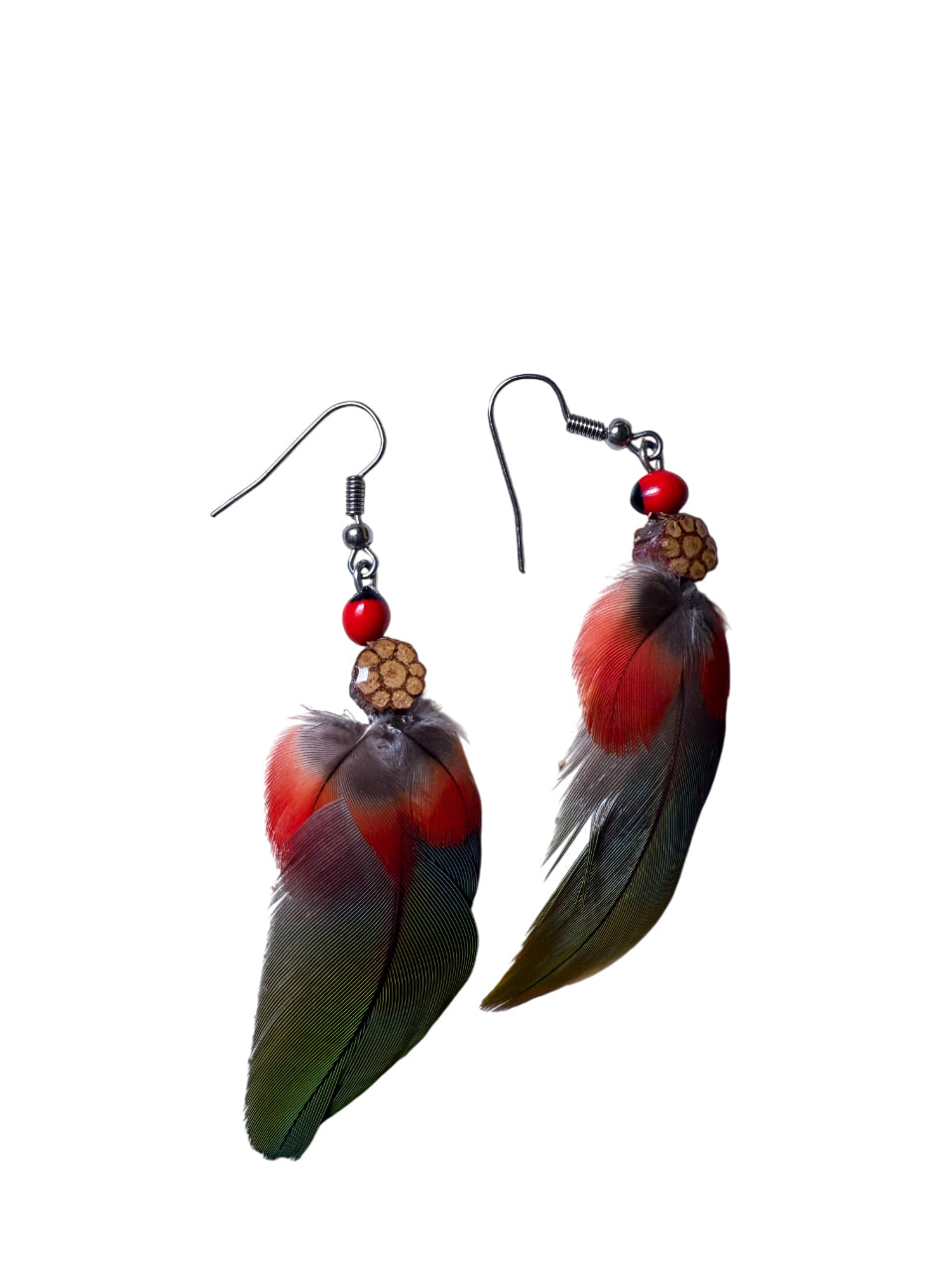 Hechos a mano con plumas reales de guacamayo seleccionadas a mano por su color y textura, semillas rojas de huayruro símbolo de abundancia y protección con detalles de madera de ayahuasca barnizada, piezas sagradas que conectan con la energía ancestral de la selva.